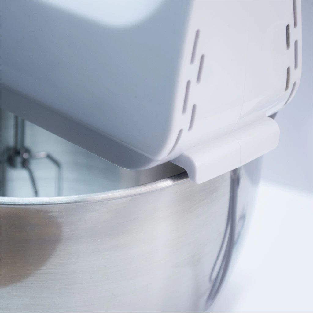 Cuenta con sistema de apoyo sobre bowl, lo que facilita su uso sin necesidad de sostenerla constantemente. Además, incluye accesorios intercambiables: batidores y amasadores, junto con un organizador de accesorios para mantener todo en orden.