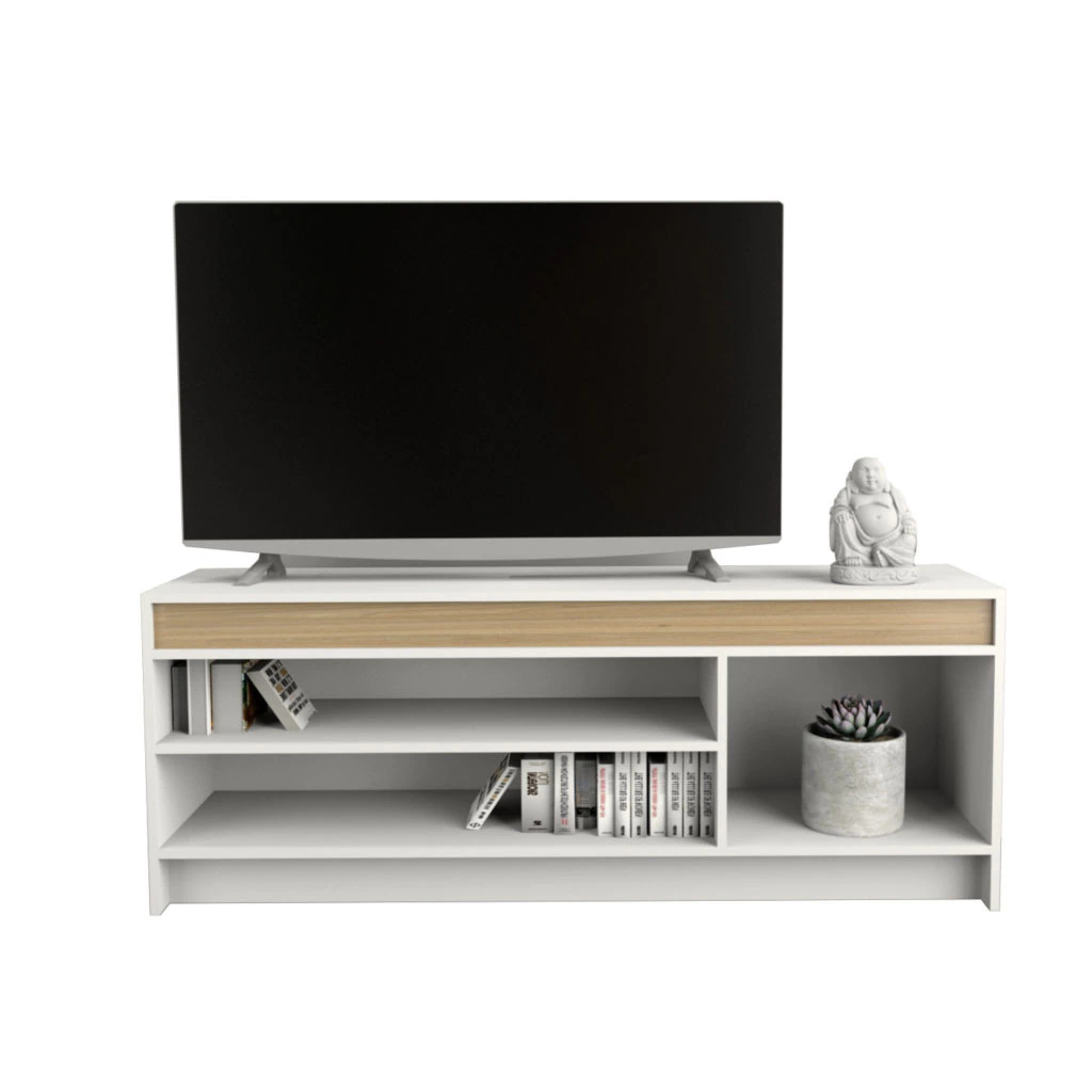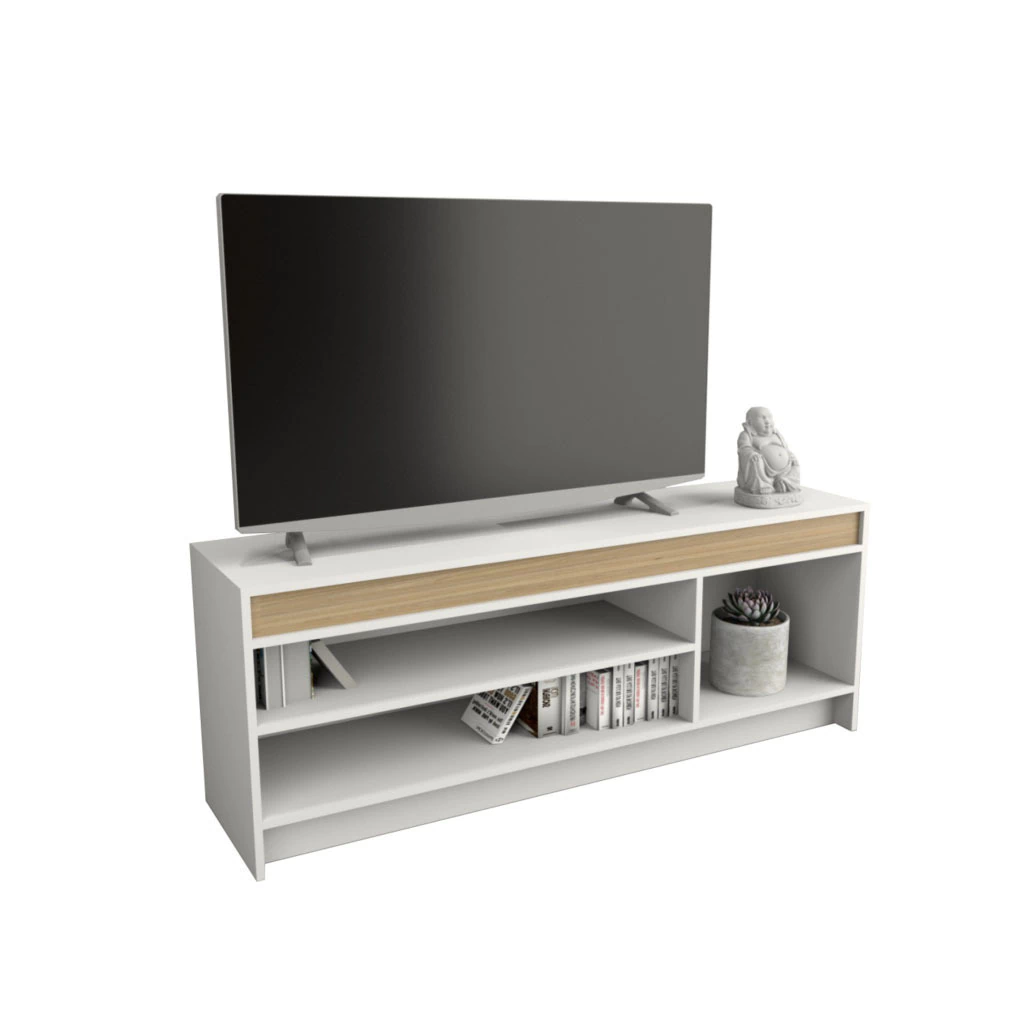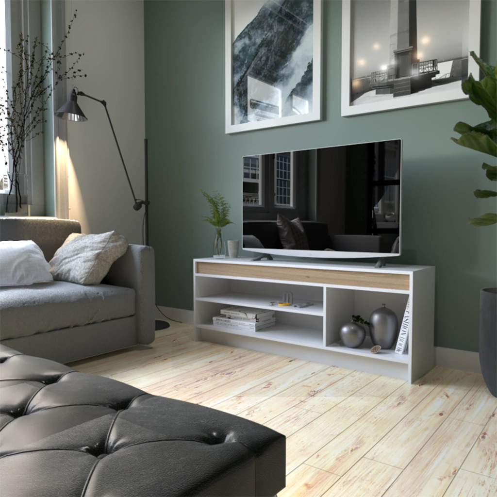 Disfruta de tus películas y series favoritas con estilo gracias a nuestra mesa TV abierta Table's 1150. Su diseño moderno y atemporal, combinado con la practicidad de un estante amplio, hacen de este mueble un complemento ideal para tu living. Con su estructura en blanco y olmo, se adapta a cualquier ambiente.