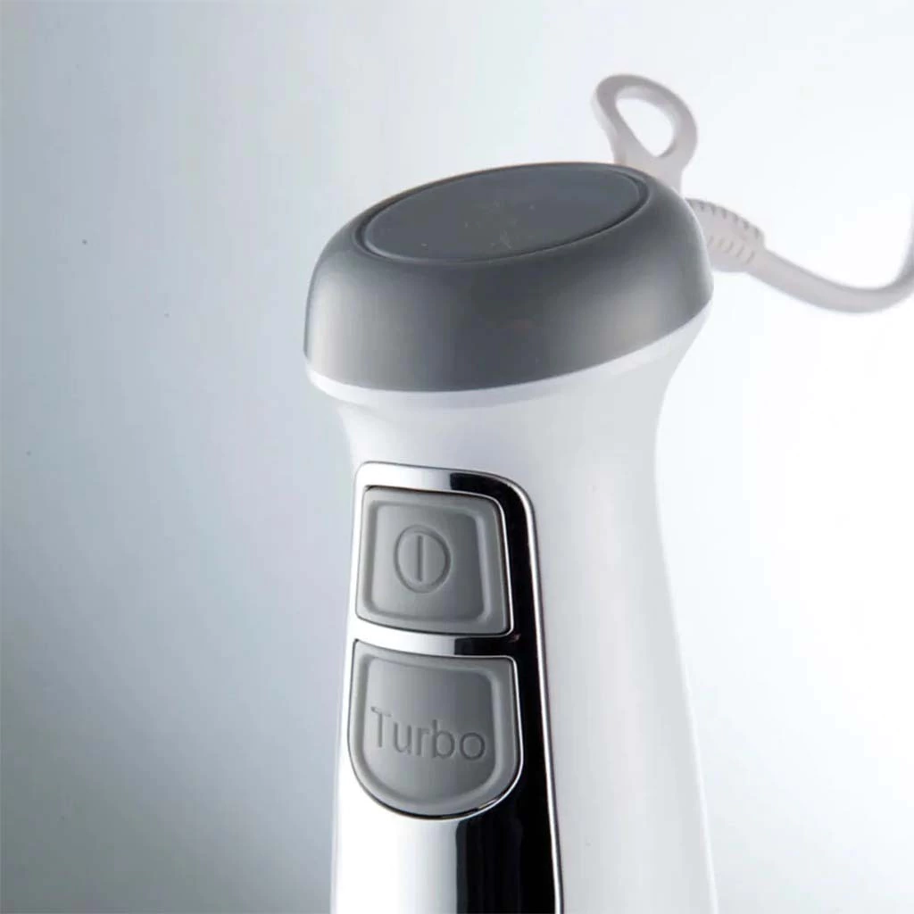 Incluye un práctico vaso medidor de 700 ml para pequeñas porciones y un batidor de alambre ideal para montar nata o claras.
