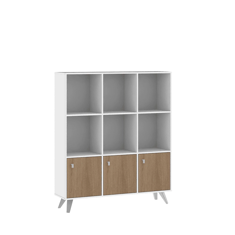 El módulo de tres cuerpos de la línea Escandinava se caracteriza por líneas simples y colores claros. Construido en melamina con un diseño nórdico este mueble está compuesto por nueve divisiones internas, tres cerradas con puertas y seis libres, puede ejercer varios usos dependiendo del ambiente en el que se lo utilice.