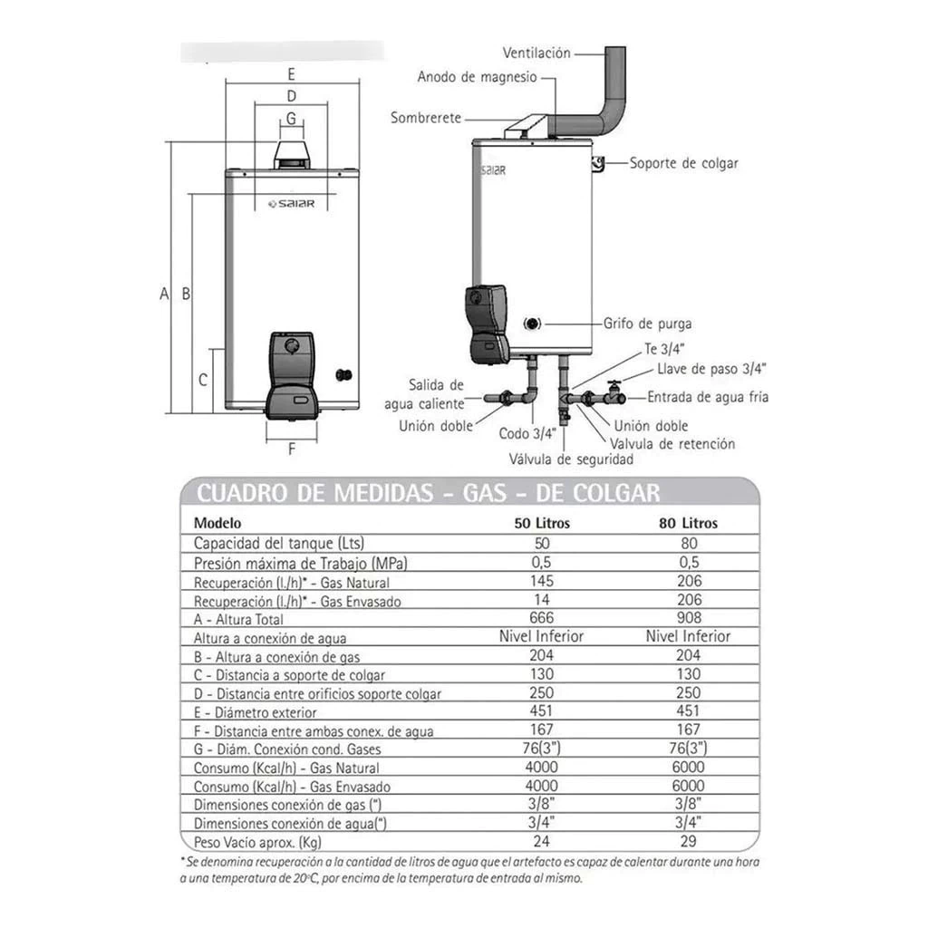 TERMOTANQUE SAIAR DE COLGAR 80 LITROS A GAS